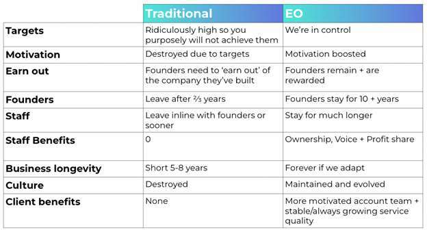Below are the 3 core reasons of why we decided to go down the EO route vs a traditional sale to a larger company: