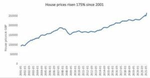 UK house prices have increased by 175% from an average of £96,500 in 2001 to £266,000 today. Over the same period gold prices are up 556% from $275 to $1,803, indicating that savers could have secured a house deposit much sooner by investing and saving in gold (see graphs below).