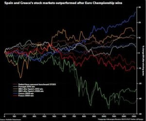 Of the last five tournament winners, Greece and Spain’s bourses outperformed the pan-European STOXX 600 after their 2004 and 2008 and 2012 wins, while only Portugal’s 2016 title was followed by notable underperformance.